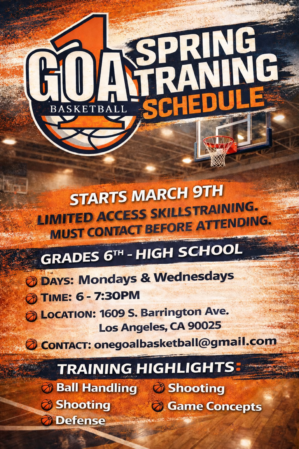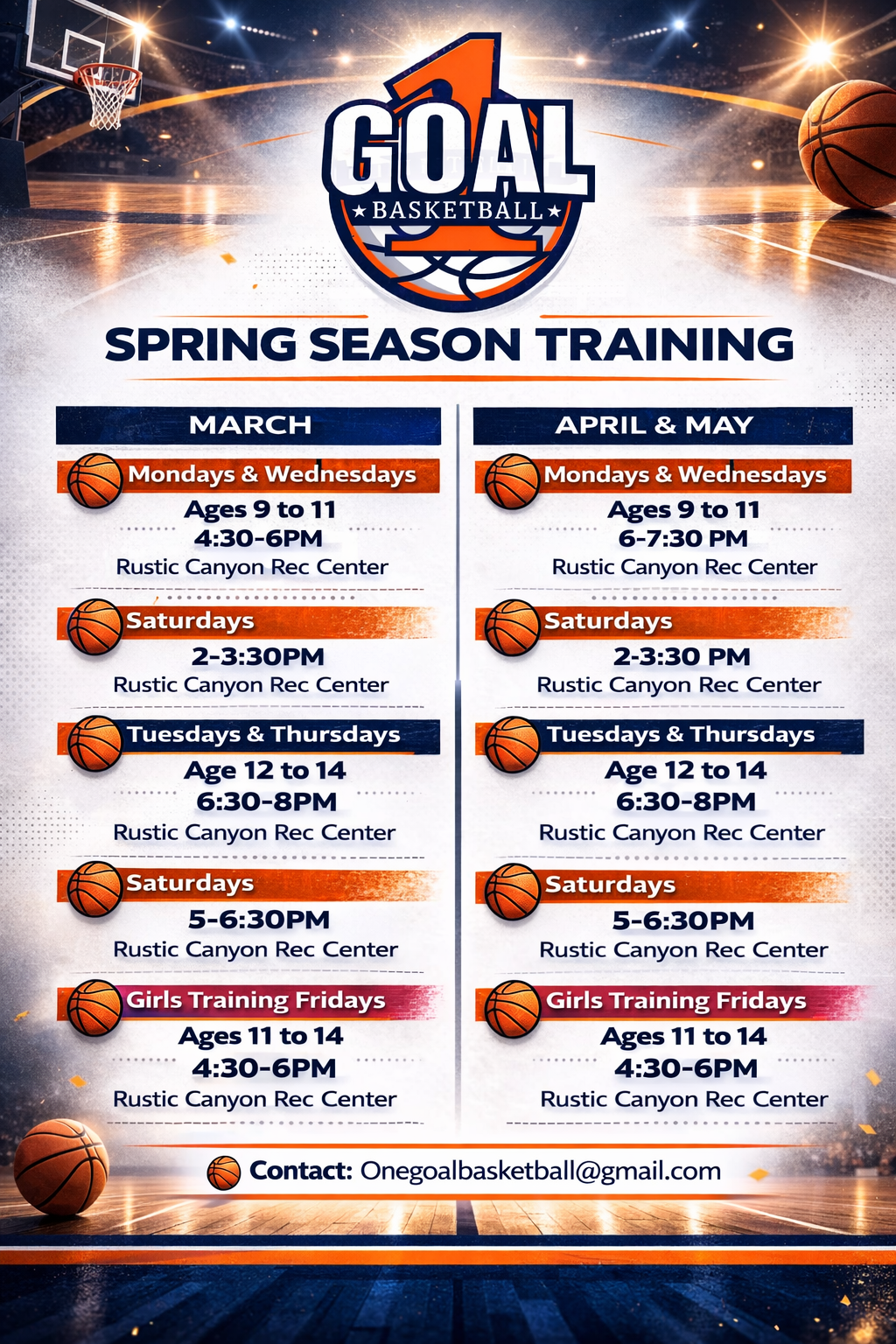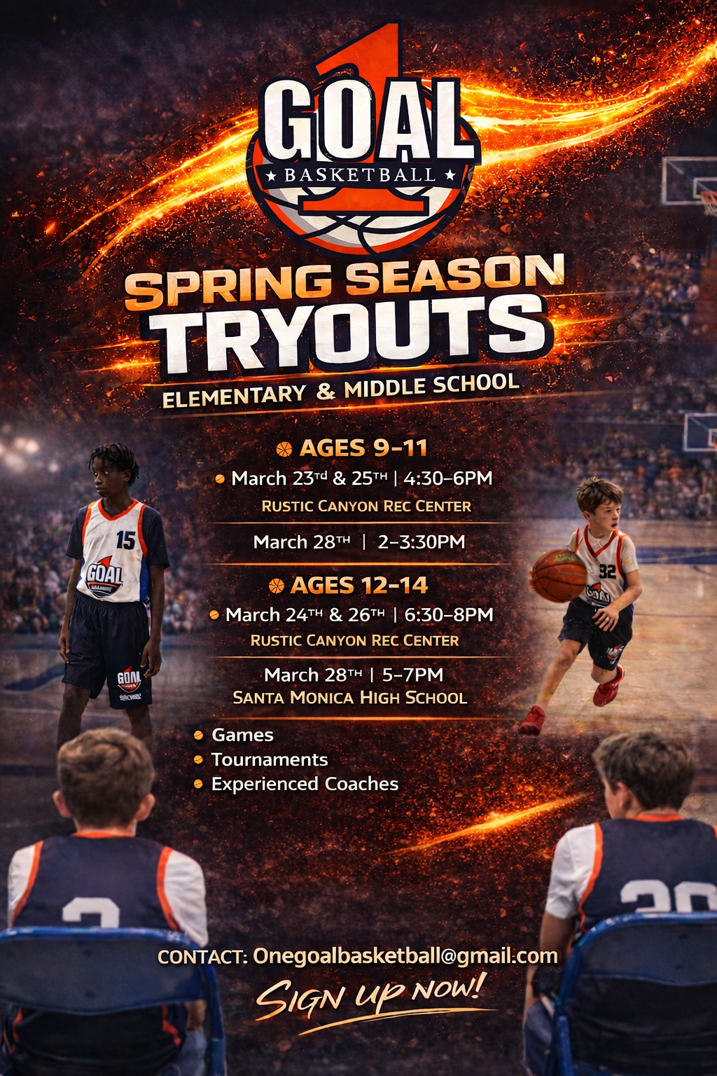 One Goal Basketball is hosting Spring Season Tryouts for players ages 9–14. We are looking for players who want to improve their skills, learn team concepts, and compete in games and tournaments. Tryouts will be held at Rustic Canyon Rec Center and Santa Monica High School. If your child is ready to grow their game in a positive and competitive environment, we’d love to see them at tryouts.